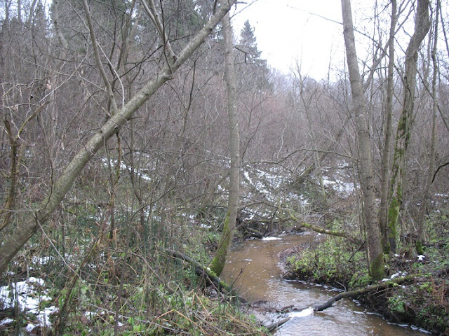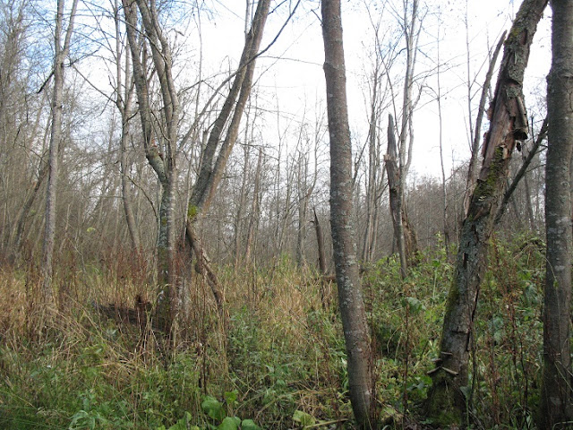 Осматриваемся. Кривые стволы деревьев это явный признак отравления. Высокая минерализация калечит деревья и в конечном итоге убивает их. Идем на ручей и промываем.