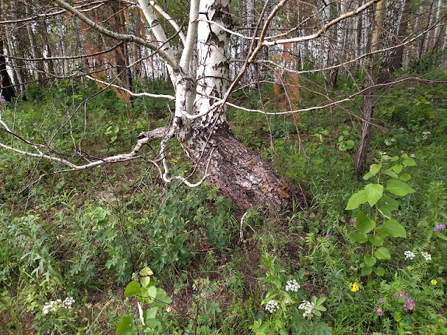 Еще очень интересное наблюдение. Кривые стволы берез. Береза сама по себе очень капризная и не любит повреждений. Если ствол березы сломали то она скорее всего умрет. На этой фотографии мы видим искривлённый ствол березы. Это не механическое повреждение. Это воздействие минералов, которые корни березы извлекают из почвы. Под поверхностью почвы есть золотосодержащий материал.