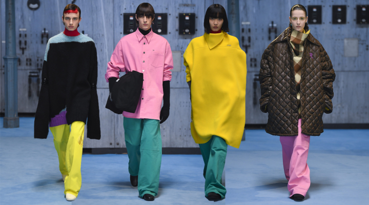 Raf Simons рифмуется с Prada и в стилизации — тому свидетельство закатанные рукава и сумки, которые модели держат в руках. В коллекции собственного бренда Симонса четко продемонстрировано умение дизайнера взаимодействовать с цветом — в палитре розовый, красный, желтый, голубой, зеленый оттенки.