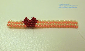 Далее, используя ту же самую технику кирпичного стежка, приплетаем сверху над имеющейся частью сердечка одну за другой две красные бисеринки,
