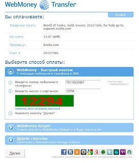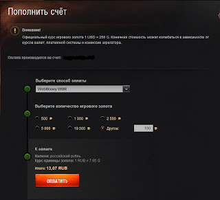 2. Заходим на сайт WoT, логинимся, кликаем «Пополнить счет», выбираем «WebMoney WMR», вводим 100 голда и кликаем «Оплатить»: