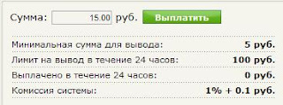 8. Кликаем на пункт меню «Вывод денег», вводим 15.00 и кликаем «Выплатить»: