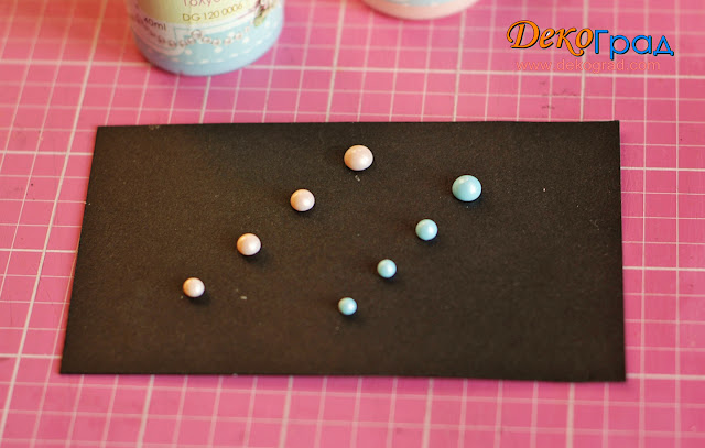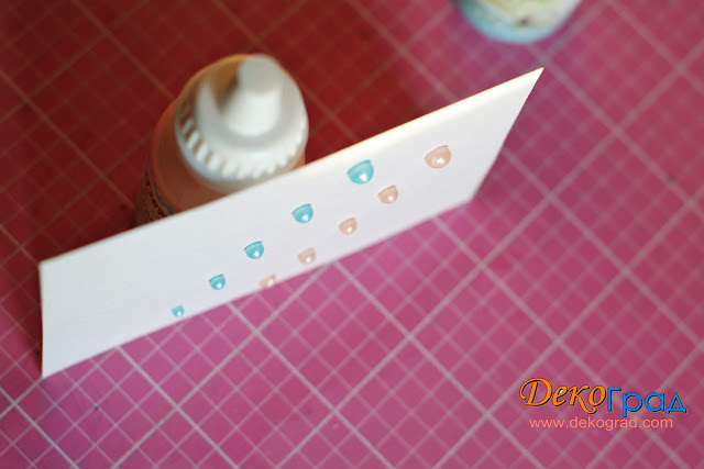 Сначала я нанесла жемчуг на кальку, которую бывает использую в слоях работы. Капельки легли аккуратно и красиво. В бежево-розовый я добавила немного воды. Он некоторое время стоял и немного загустел. Потому вы видите, что капли голубого цвета — не разбавленные, более округлой формы.