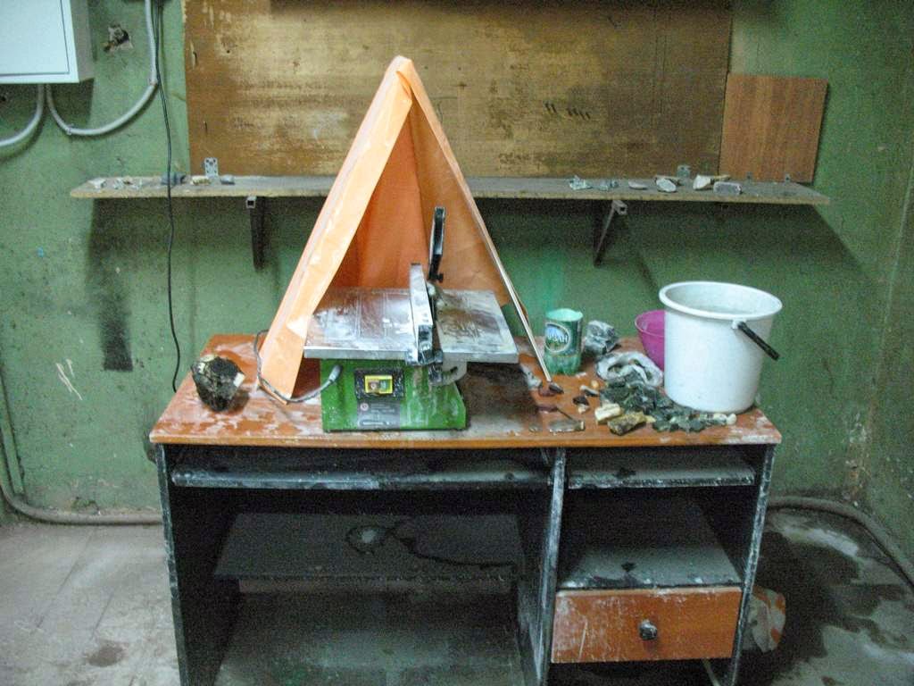 Хочу обратить внимание на небольшое дополнение к станку. Тряпочка отсекающая лишнюю воду. Если пилить без нее, то через пять минут будешь мокрый с головы до ног.