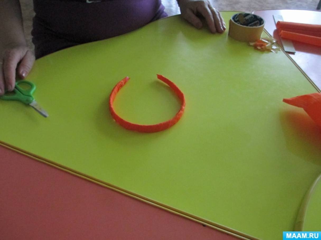 Для изготовления нам понадобится гофрированная бумага любого цвета, ободок для волос простой, пластмассовый, двойной скотч, ножницы.