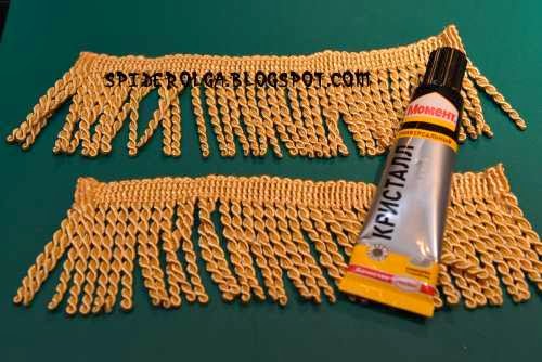 Когда после первой пары эполет осталось кусок бахромы, около 50 см, я его разрезала пополам. С обеих сторон кончики подлеила во внутрь, чтоб бахрома не осыпалась. Вот к этим кусочкам и подгоняла размер эполет.