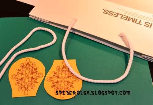6. Приклеила шнур на обратную сторону. Мне показалось, что бахрому будет сложно приклеить к тонкому торцу картона, а вот к картону + шнуру, приклеится без проблем. А если дома нет шнура, как у меня, то можно ручки отрезать от магазинного или подарочного бумажного пакета, которых у меня, например, имеется в достатке. Клеила на клей Кристалл, уверена, что можно на горячий пистолет, только я с ним не дружу.