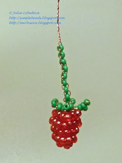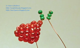 Если же ягодку в дальнейшем мы будем прикреплять к веточке малины, черешок должен быть длиннее. Я для таких ягод сплела черешок из 10 бисеринок.