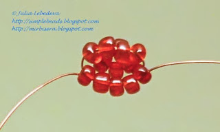 Затягиваем проволоку, стараясь, чтобы бисеринки оставались примерно на середине проволоки. У нас получились два яруса первого ряда: верхний ярус состоит всего из одной бисеринки, а нижний ярус — из трёх бисеринок.