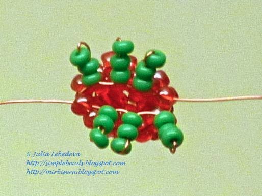 Придерживаем последнюю набранную бисеринку и пропускаем этот конец проволоки через две остальные зелёные бисеринки в обратном направлении.