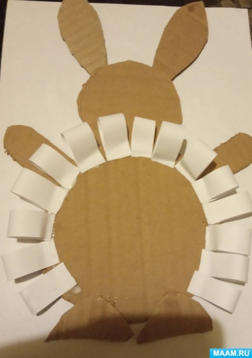 - Используя рисунок, как трафарет, переносим кролика на картон (без ушей и хвостика);