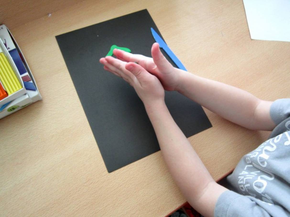 5. Из оставшегося зеленого пластилина сделайте плоские длинные лепешки, размяв их пальцами.