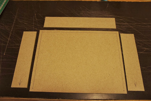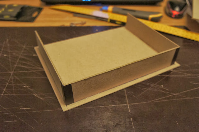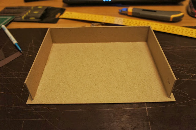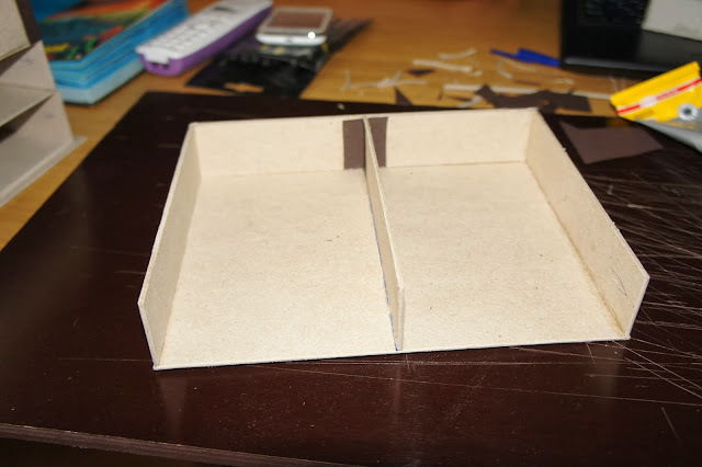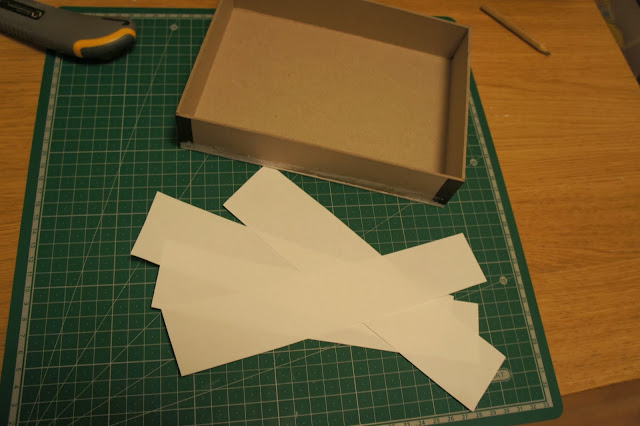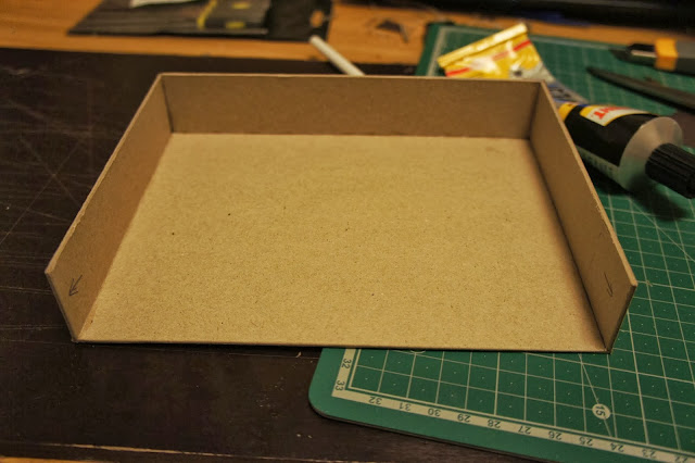 Вырезаем прямоугольник равный: Длина нижнего дна :)) минус 0,5см *2 (0,7 или иной припуск, который Вы для себя выбрали) и минус две толщины картона