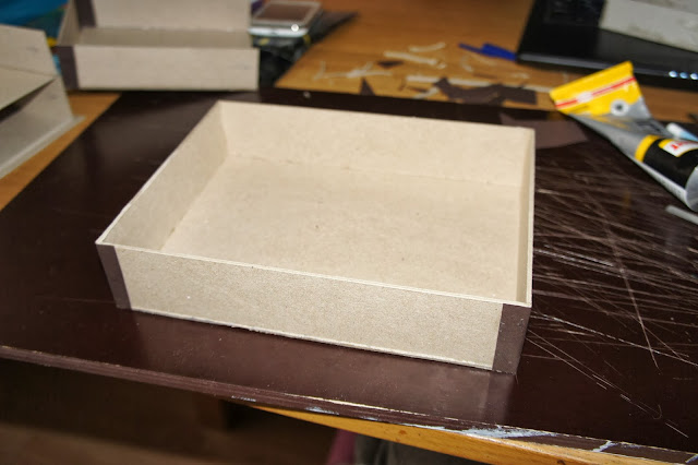 На фото я, сначала, приклеила бортики к дну, а потом внутрь вклеила «второе дно». Как показала практика — лучше сделать не так. Вариант, описанный ниже сложнее, но итог лучше.