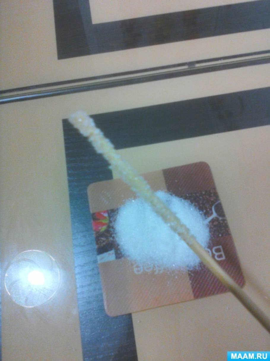 - Затем рассыпаем на листе бумаги сахар и катаем по нему палочку, чтобы кристаллики сахара как следует прилипли. Надо проследить, чтобы сахар прилип равномерно, иначе кристалл вырастет неровным.