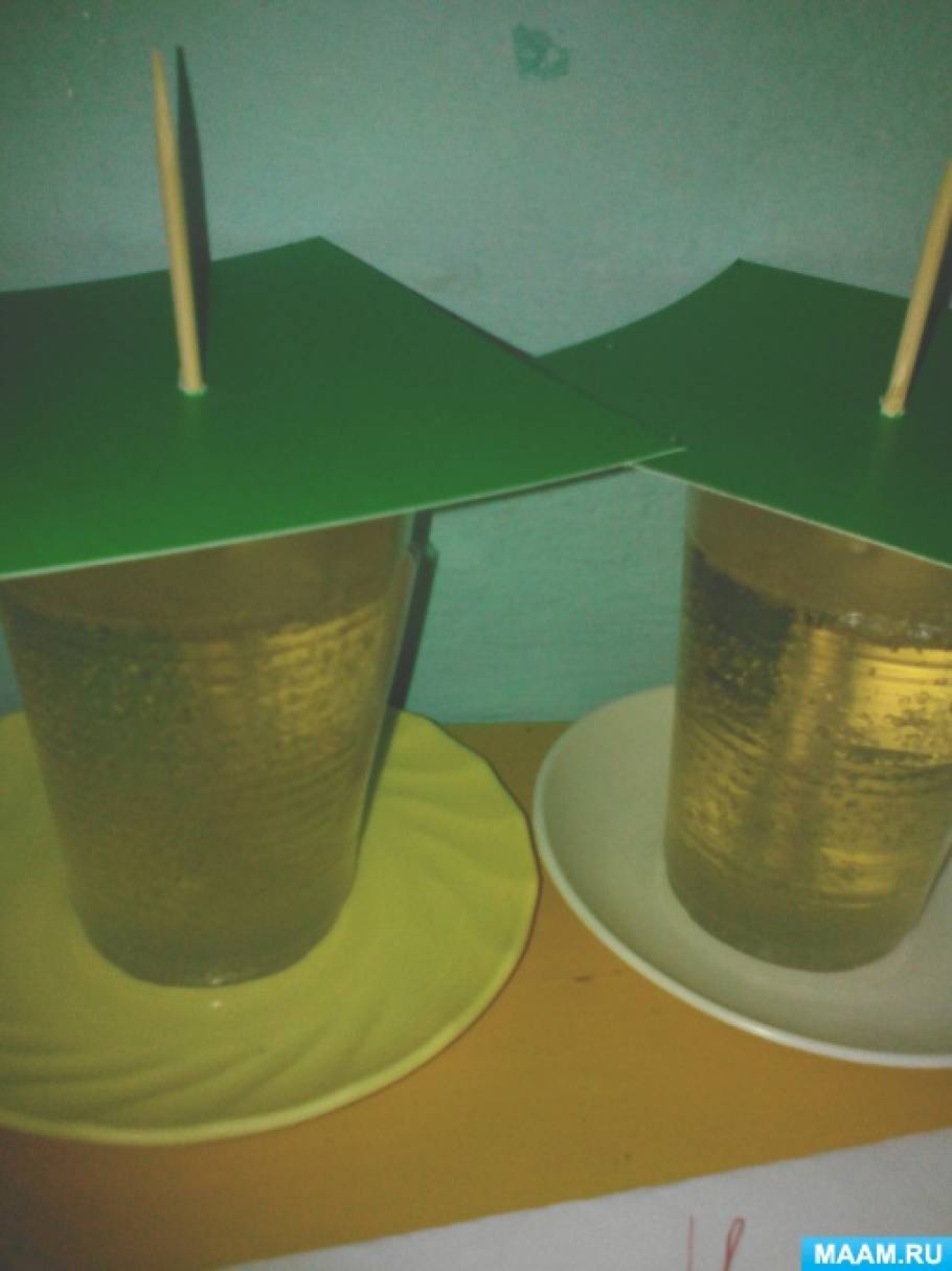 Теперь нужно закрепить шпажки так, чтобы они были погружены в сироп, но не касались дна и стенок стакана. Помогут картонки.