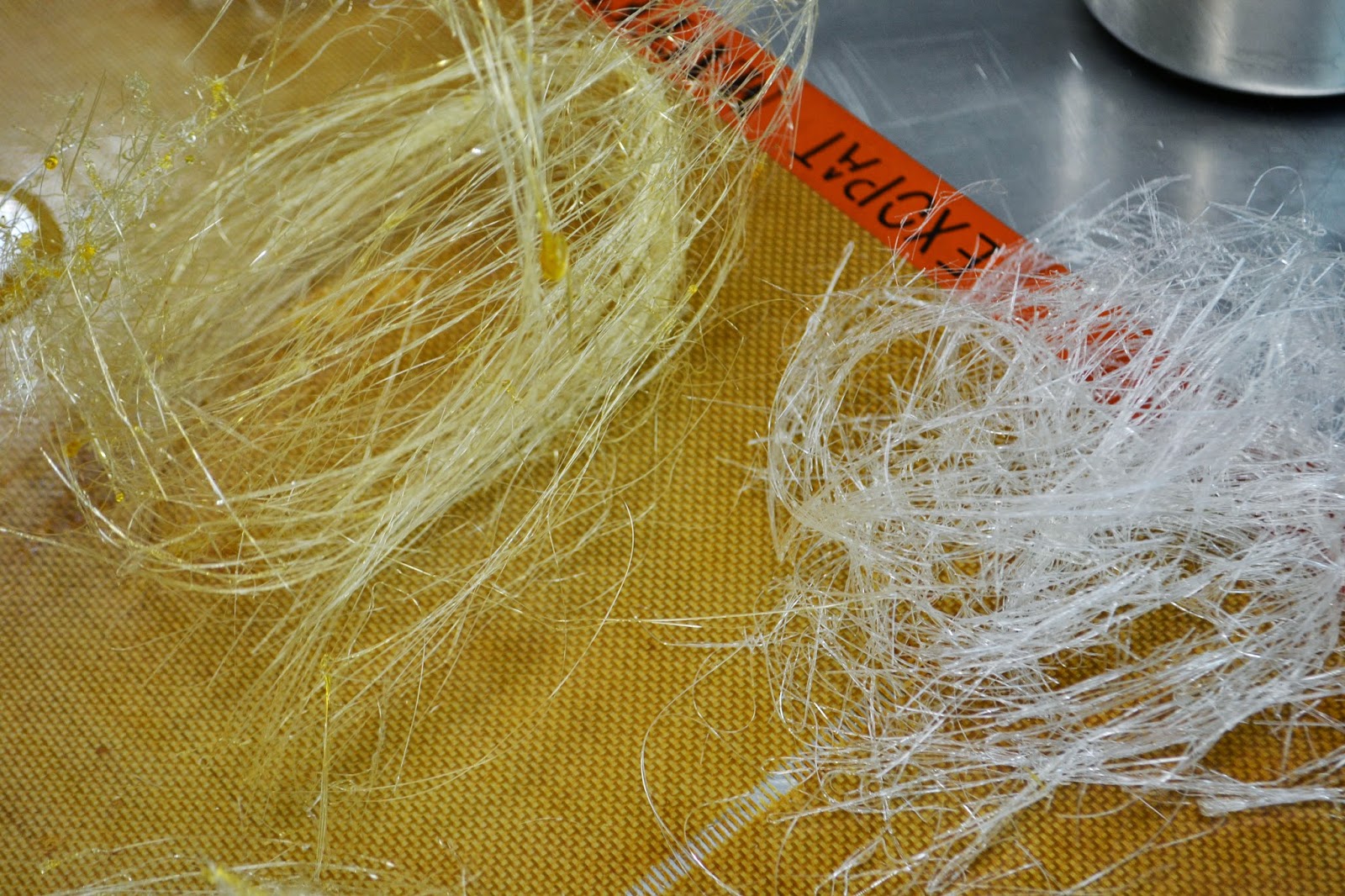 Помимо помадки, в состав карамели входят глюкоза и изомальт. Эту смесь доводим до 160 градусов, немного охлаждаем и тут начинается магия. На слегка смазанную маслом скалку быстрыми движениями руки распределяем тонкие нити карамели.