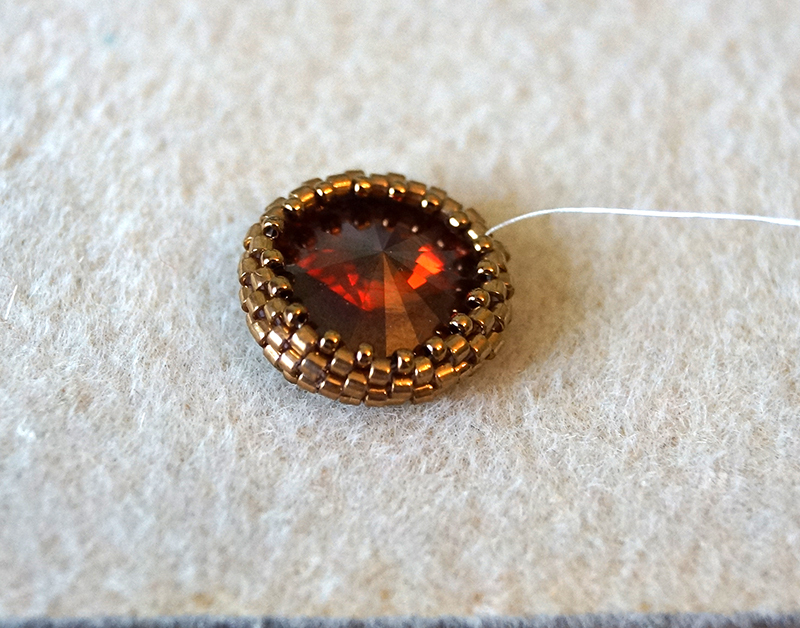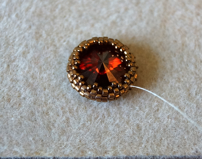 Вкладываем камень в получившуюся "корзинку" оправы изнаночной стороной камня вниз, выводим иглу на свободный край цилиндрических бисерин и плетем один ряд бисером 15" размера для стягивания оправы