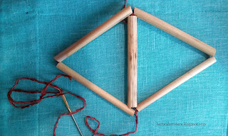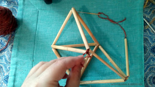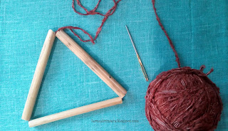 1.Нанизываем три трубочки на шерстяную нить и завязываем узелок, чтобы получился треугольник.