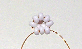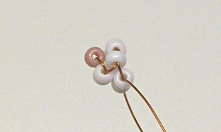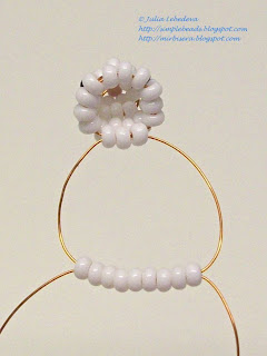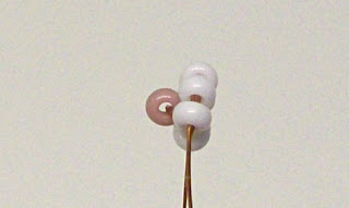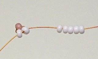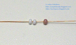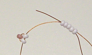 Тот конец проволоки, со стороны которого набрана розовая бисеринка, пропускаем через две белые бисеринки со стороны другого конца проволоки.