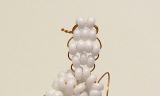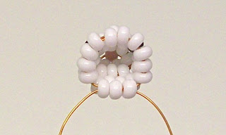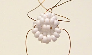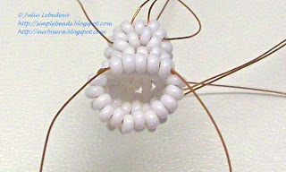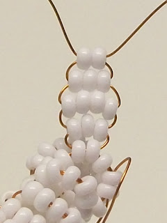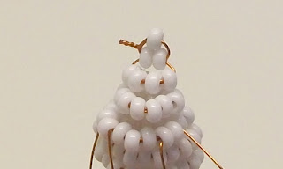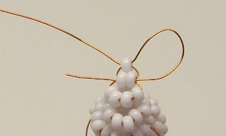 Затягиваем проволоку и размещаем последние набранные бисеринки над двумя белыми бисеринками нижнего яруса первого ряда.