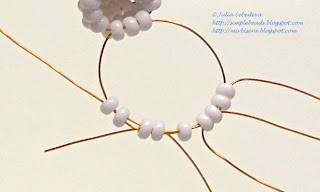Для нижнего яруса набираем 11 бисеринок, но проволоку туго не затягиваем. Берём два последних дополнительных отрезка проволоки длиной по 20 см и пропускаем их через третью и четвёртую по счёту бисеринки с каждой стороны текущего яруса.