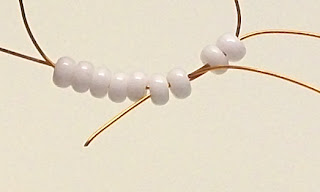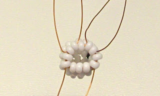 - Нанизываем на любой из концов 3 белые бисеринки, пропускаем через них второй конец, затягиваем и размещаем внизу под уже набранными.