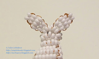 ЗАЯЦ 1. Наберите на середину проволоки длиной 45 см 13 бисерин для уха. Проведите проволоку через первую бисерину, образовав петлю. Наберите 2 бисерины, плюс 13 бисерин на ухо, проведите проволоку через третью из набранных бисерин. 2. Далее подплетите 4 ряда. Для лапки наберите 7.