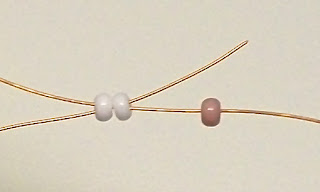 Сначала набираем на проволоку 1 розовую и 2 белые бисеринки и размещаем их на середине проволоки.