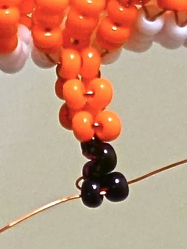 Верхний ярус — набираем бисеринки в следующем порядке: 1 оранжевая, 1 чёрная, 2 оранжевые, 1 чёрная, 1 оранжевая.