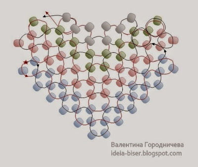 Во внутрь сердечка можно засыпать тот же бисер которым вы делаете сердечко, или подобрать похожего цвета китайский. Во внутрь уходит не так уж много бисера, 10 грамм хватит и на изделие и на заполнение сердечка. В схеме, для удобства, ряды выделены отдельным цветом, начало отмечено звёздочкой, а две нити разными цветами.