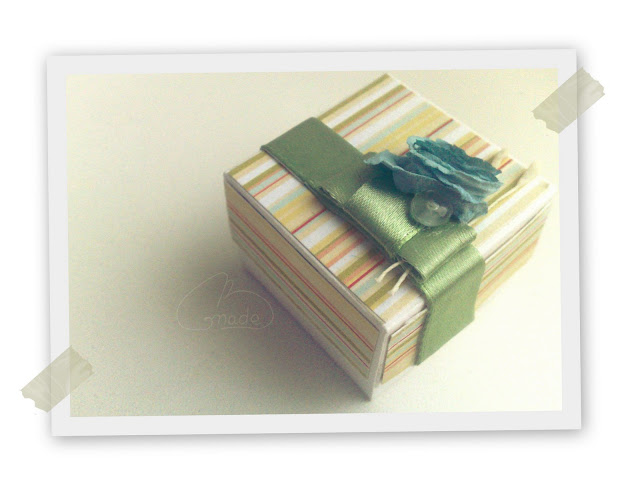 Размеры небольшие (4х4 и высота 3см), ушел на все про все один лист кардстока белого А4. Сначала мне виделась такая коробочка достаточно стандартная, из черного кардстока и какой-нибудь ленты. Потом я вспомнила, что у меня есть еще почти целая упаковка бумаги от Webster’s Pages 15Х15 (не помню какая коллекция), нашла подходящий дизайн (хотелось полосочек или горошка), да тем более цвета такие задорные. Сначала завязала бантик, а потом подумалось, что как-то пустовато. И нашла у себя розочку бумажную синего цвета)) Когда-то давно сделала эти цветы.