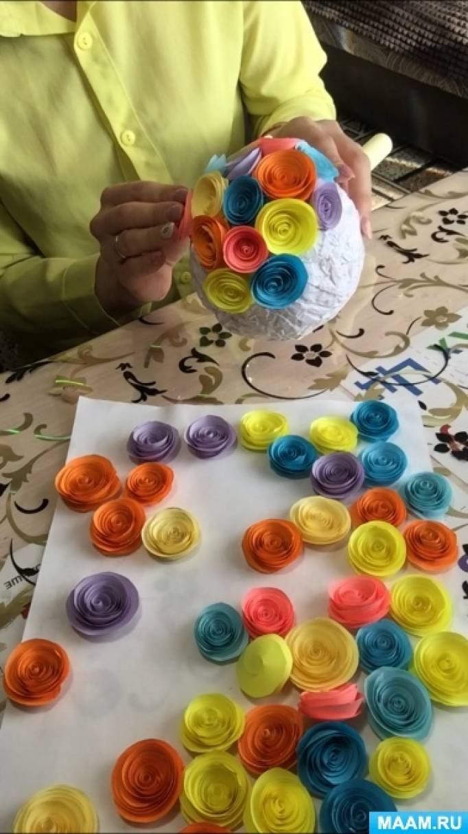 Далее, с помощью горячего клея, начинаем клеить спиральные розочки на бумажный комок.
