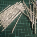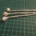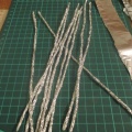 Далее каждый элемент необходимо скатать в жгут. При этом несколько подобных «колбасок» должны быть тонкими, а часть следует сделать плотнее. Именно эти элементы и будут каркасом для подсвечника. На толстом жгутике необходимо отступить 6,5 см от края и согнуть элемент на 90°. Еще через 10 сантиметров необходимо проделать аналогичную процедуру.