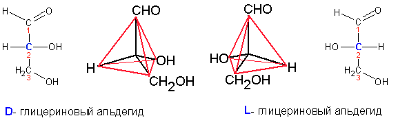 Если представить себе пространственную модель молекулы глицеринового альдегида, вписанную в тетраэдр, в центре которого располагается асимметричный атом углерода, а по вершинам направлены заместители при нем, то получится примерно такая картина:
