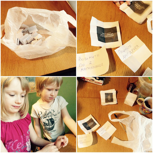 Я позвала детей, предложила тянуть по очереди. Самой первой бумажкой Валентине вытянулось «взять по две мармеладки», что сразу настроило их с братом крайне позитивно к предстоящей игре! 🙂 Дальше ответы буквально сыпались, хотя, все-таки надо отметить, перед тем, как тянуть бумажку, дети как мантру повторяли слова: «Только бы не загадку. Только бы не загадку». 😉 Дети хотели вытащить «действие». 🙂 Всеволод тоже тянул бумажку, разворачивал, а потом давал сестре читать текст. 🙂 Тянули так по очереди.