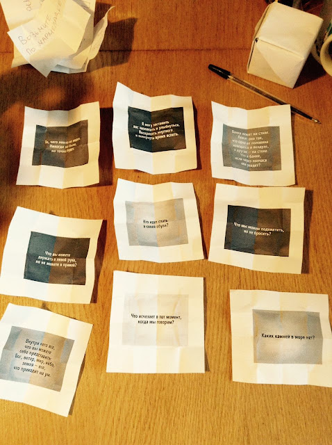 Но так как я распечатала загадки списком, то напрашивалось — разрежь. Я разрезала. Тут же появилась идея: свернуть все загадки и тянуть их по очереди, по очереди отвечать. Отлично, готово. Но все равно как-то скучновато. Хочется добавить неожиданность. Точно!