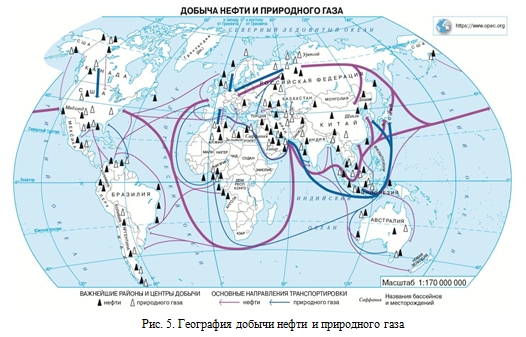 Для некоторых стран добыча и экспорт продукции добывающей промышленности являются основой их экономического развития. Например, Саудовская Аравия, занимая первое место в мире по объёмам добычи нефти (580 млн т в год), также является мировым лидером и по ее экспорту (460 млн или 80% от добычи) (рис. 5).