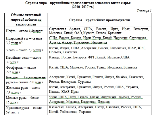 Основную часть стоимости продукции добывающей промышленности (порядка 70%) обеспечивает добыча топлива (нефти, природного газа и угля). (Как вы думаете почему?) Значительный вклад в стоимость продукции добывающей промышленности вносит также добыча руд черных и цветных металлов и сырья для химических производств. ( Используя данные таблицы 1, объясните, почему среди лидеров по добыче разных видов минерального сырья часто находятся одни и те же страны?)