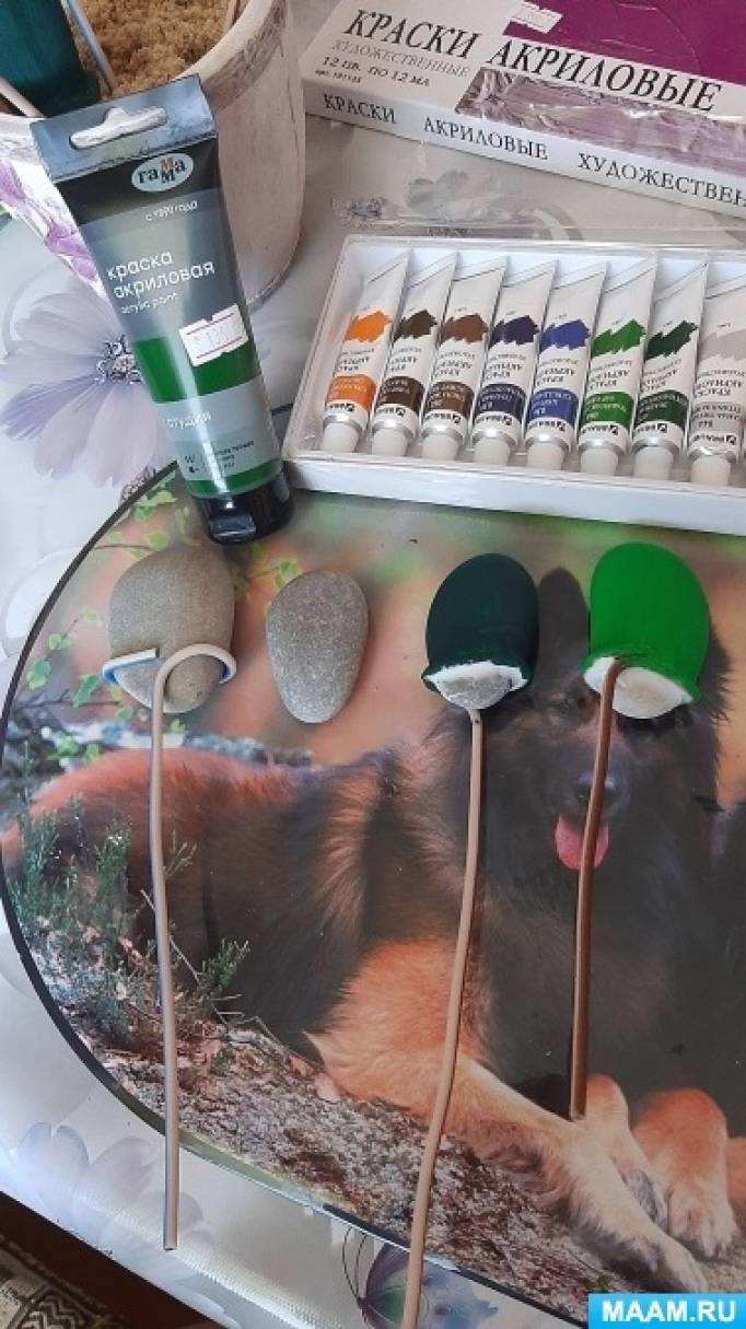 1. Зеленой акриловой краской красим наши камешки. Чтобы удобнее камень было держать мы использовали канцелярскую прищепку. В ней же удобно ставить камень сушиться.