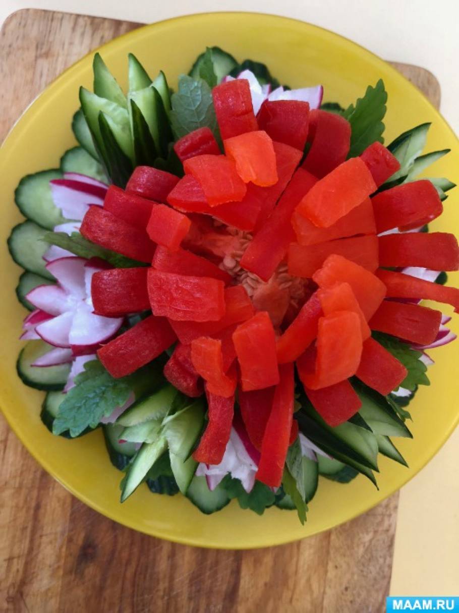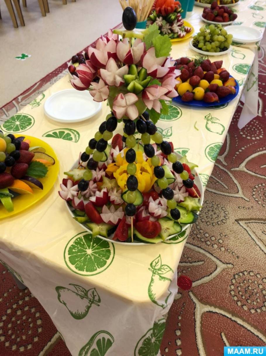 беседа, демонстрация различных способов украшения из овощей и фруктов, составление композиции из овощей и фруктов к праздничному столу, обучение приемам карвинга.