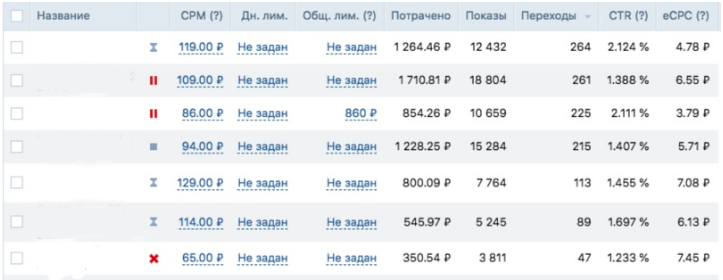 Часть рекламного кабинета проекта Вконтакте