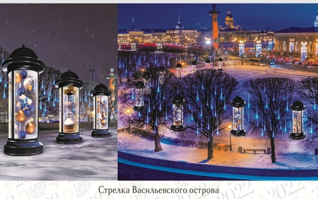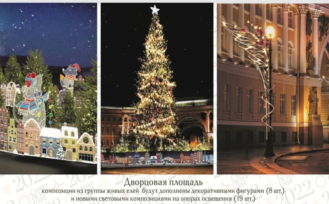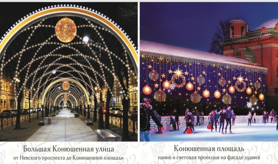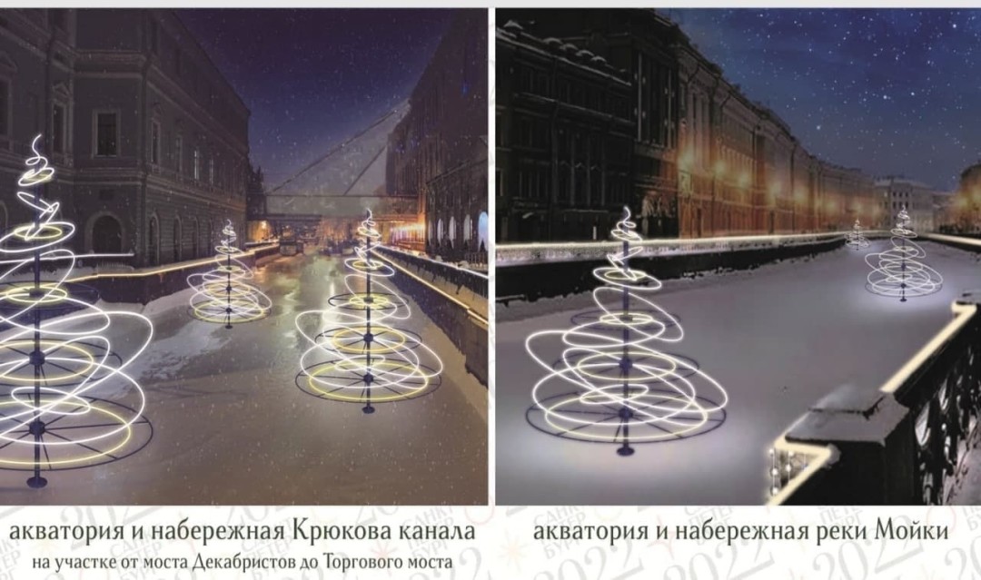 Световые инсталляции в виде новогодних елок установят прямо на льду на набережной Крюкова канала и Мойки. Иллюминация появится и на Певческом мосту и канале Грибоедова. На конюшенной площади будут транслировать световые проекции. На Большой Конюшенной улице установят арки из праздничных гирлянд. На стрелке Васильевского острова появятся тумбы с песочными часами и новогодними подарками, а также «световые сосули» на деревьях.