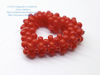 Таким способом плетения делаете и следующий ярус. Но, не забудьте зафиксировать в первую петлю две штучки. Смотрите по фото сердечек, как закрепить 6 бусин.