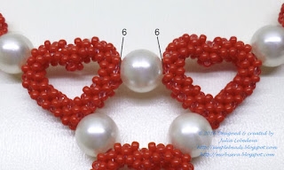 Соединяем их между собой с помощью одной бусины, которую прикрепляем к бисеринкам номер 6, находящихся на центральной линии внешнего периметра каждого из этих сердечек.