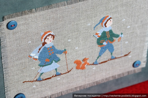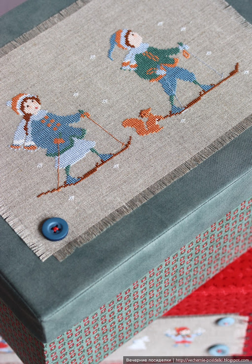 Первая вышивка довольно большая, приделала её на крышку коробки. Эта парочка уже получила у нас в семье название «Магдалена Нойнер и Бьорндален», любители биатлона поймут. 🙂
