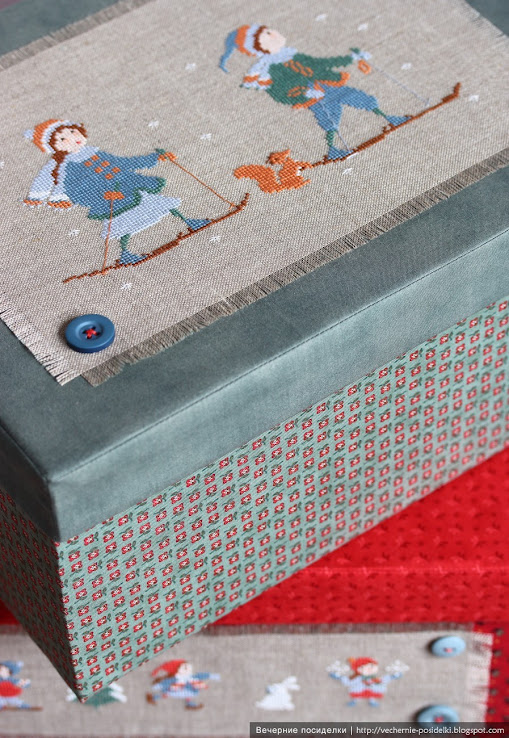 Коробки обтянуты тканью и украшены вышивкой. Оба дизайна от мастера по «человечкам» — Perrette Samouiloff. Так как они вызывают у меня стойкие ассоциации со старинными картинками, то и оформление соответствующее. С выдернутой бахромой и на пуговицах, причём разного размера, чтобы придать им некоторую небрежность, состаренность и может быть даже эффект временных ярлычков.