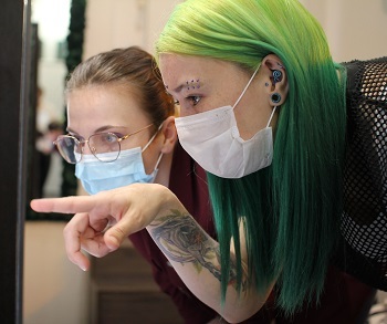 — Колористика и визаж. Работаю в сфере веб-разработок. На этой достаточно серьезной работе к моему стилю относятся вполне нормально, то есть мое увлечение пирсингом и тату никак не влияет на работоспособность.