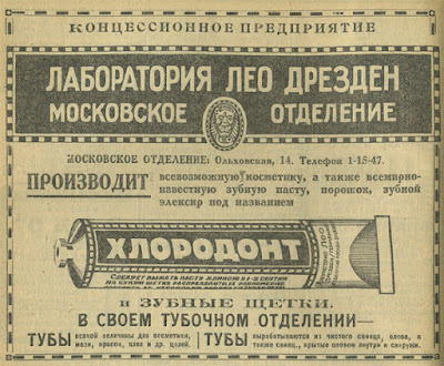 Также после революции в СССР продавали знаменитую пасту «Хлородонт», изобретённую в 1907 году Оттомаром Хайнсиусом фон Майенбургом, работником одной из дрезденских аптек.