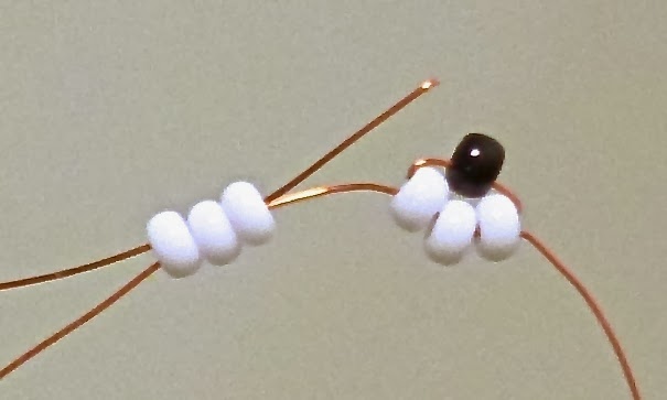Тот конец проволоки, со стороны которого набрана чёрная бисеринка, пропускаем через 3 белые бисеринки с другого конца проволоки.